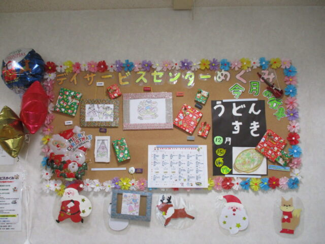 デイサービスのぞみ、クリスマスの飾りつけが完成しました。小さなサンタさんが可愛いですね