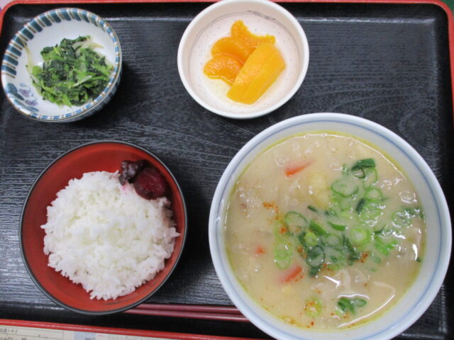 1月23日㈮のお昼ご飯、「ご飯・粕汁・小松菜胡麻和え・フルーツ・漬物」でした。ご馳走様でした。