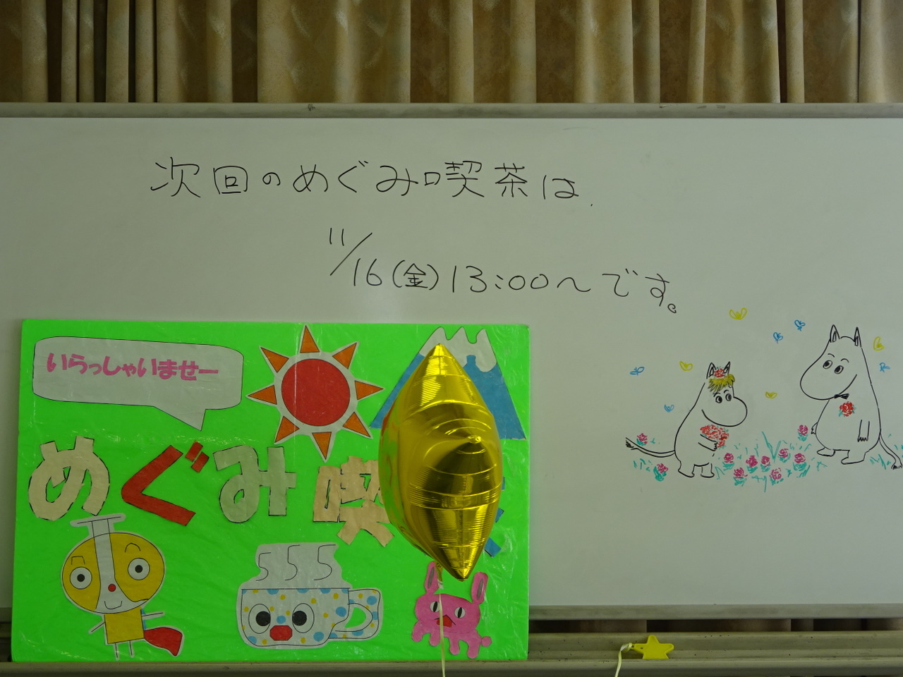 2018.10.19 めぐみ喫茶 でした ♪ 今日は、「めぐみ喫茶」でした 今日のおやつは、「おはぎ」 ミニお菓子付き飲物は、¥100 おやつは ¥50です またのお越しを、お待ちしております 総合相談窓口めぐみ <ALL>