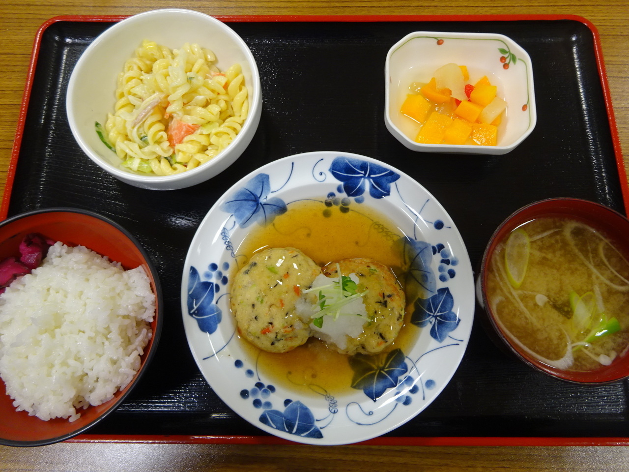 豆腐ハンバーグ・マカロニサラダ・みそ汁・フルーツ・ごはん