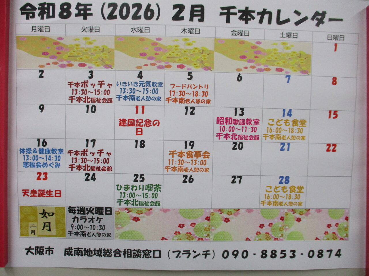 2026.02.03 2月3月の予定表(^^)v予定 在介めぐみ、2月と3月のお知らせです。 「100歳体操」は2月16日㈪ 13:00~14:30です。 「想い出教室」は3月10日㈫ 13:30~15:00です。 ALL>